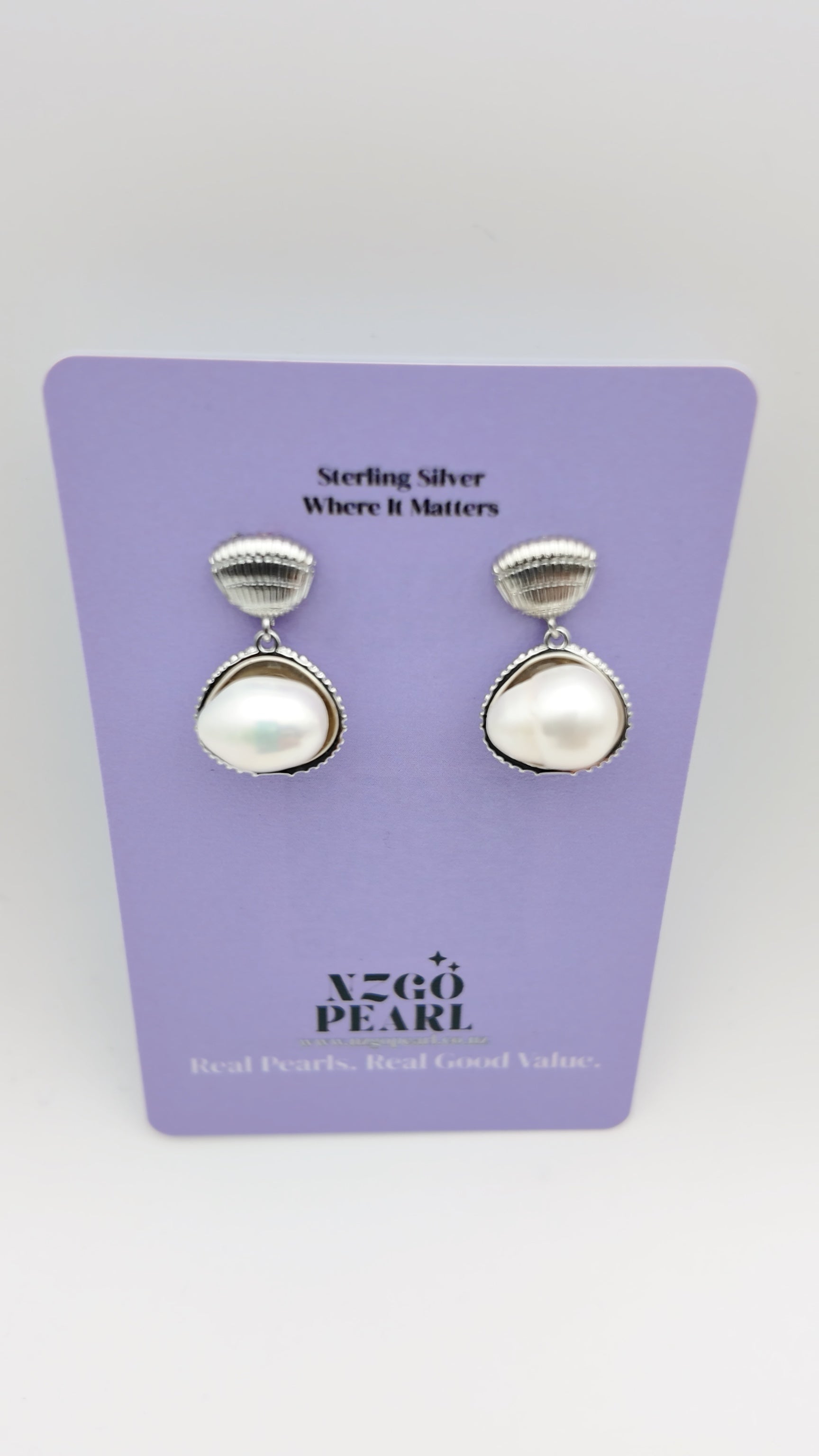 A soft ocean-inspired design featuring a ridged silver seashell top and a natural baroque pearl drop. The organic pearl shape adds character and uniqueness to every pair.