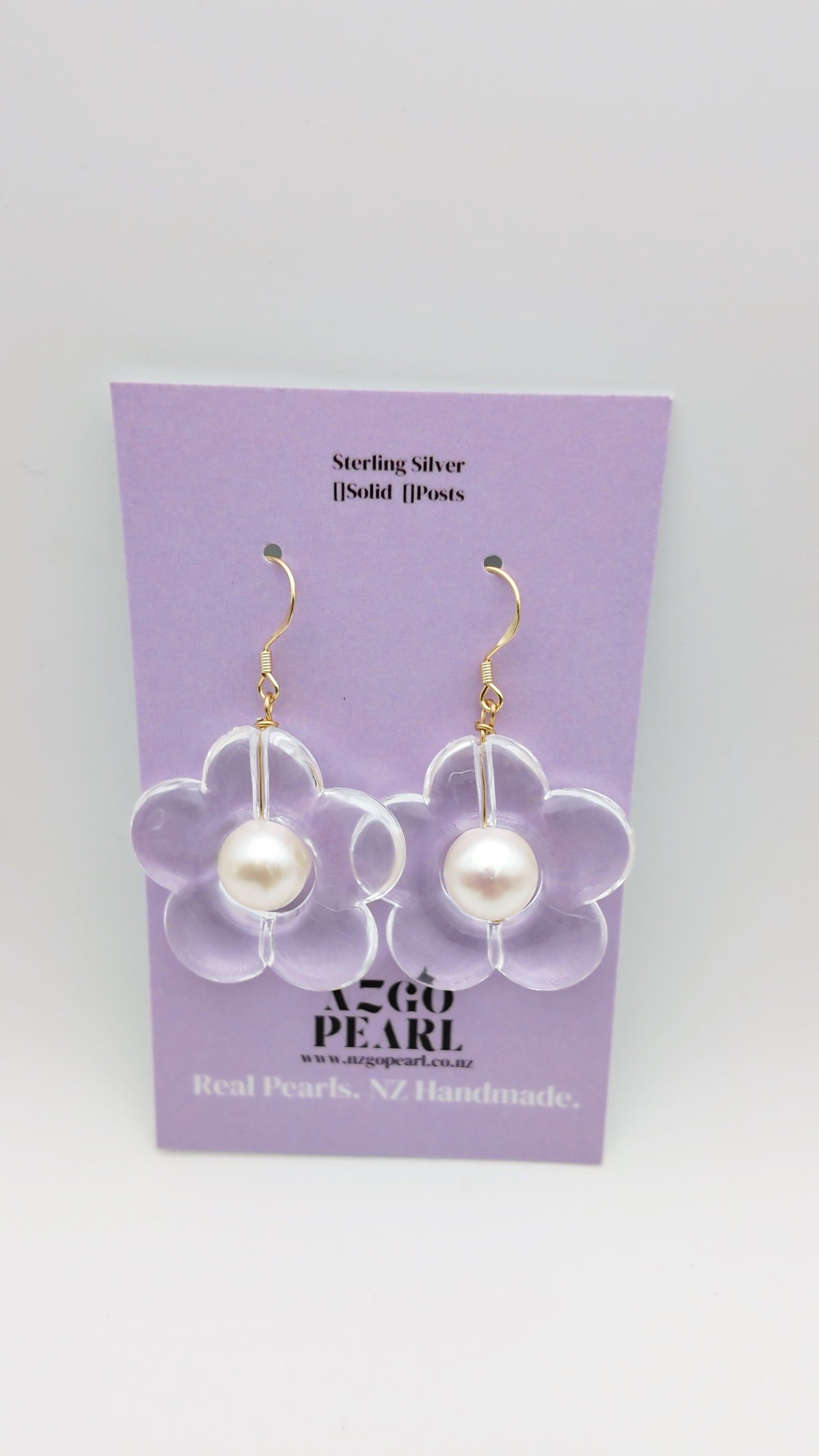 Soft, translucent petals meet a luminous real pearl in this playful yet elegant glass effect blossom design. The purple tint you see comes from the card behind the glass — the petals themselves are completely clear, giving them a delicate floating effect when worn. Paired with solid sterling silver hooks, they’re light, bright, and perfect for adding a sweet pop of charm to your everyday look.