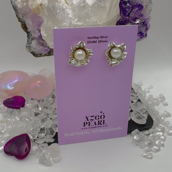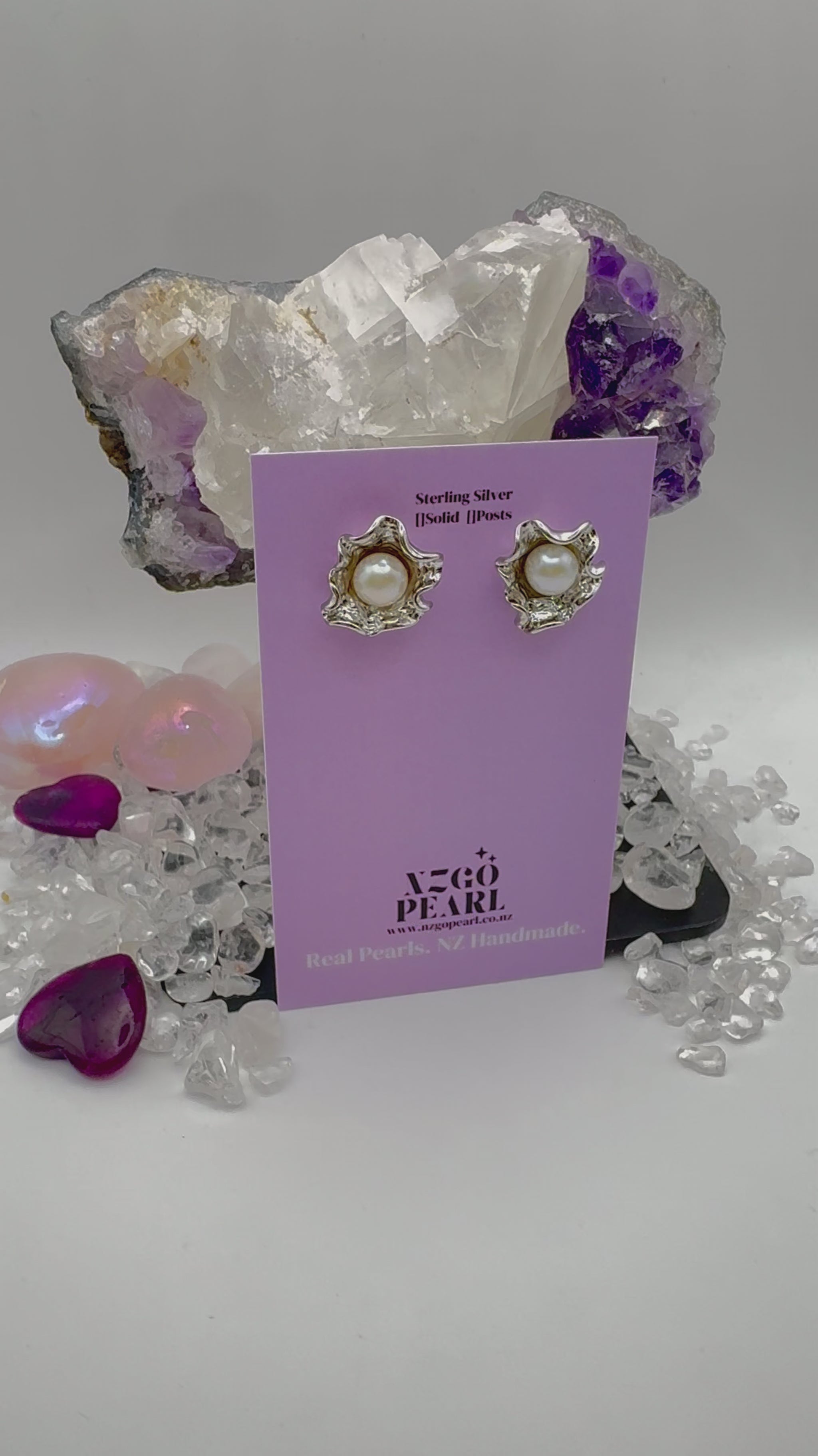 Inspired by nature’s delicate blooms, these earrings feature real freshwater pearls nestled within a sculptural petal-like frame. The silver-plated, textured edging creates a soft floral silhouette that complements the gentle luster of the pearl. A subtle statement with a touch of vintage romance.