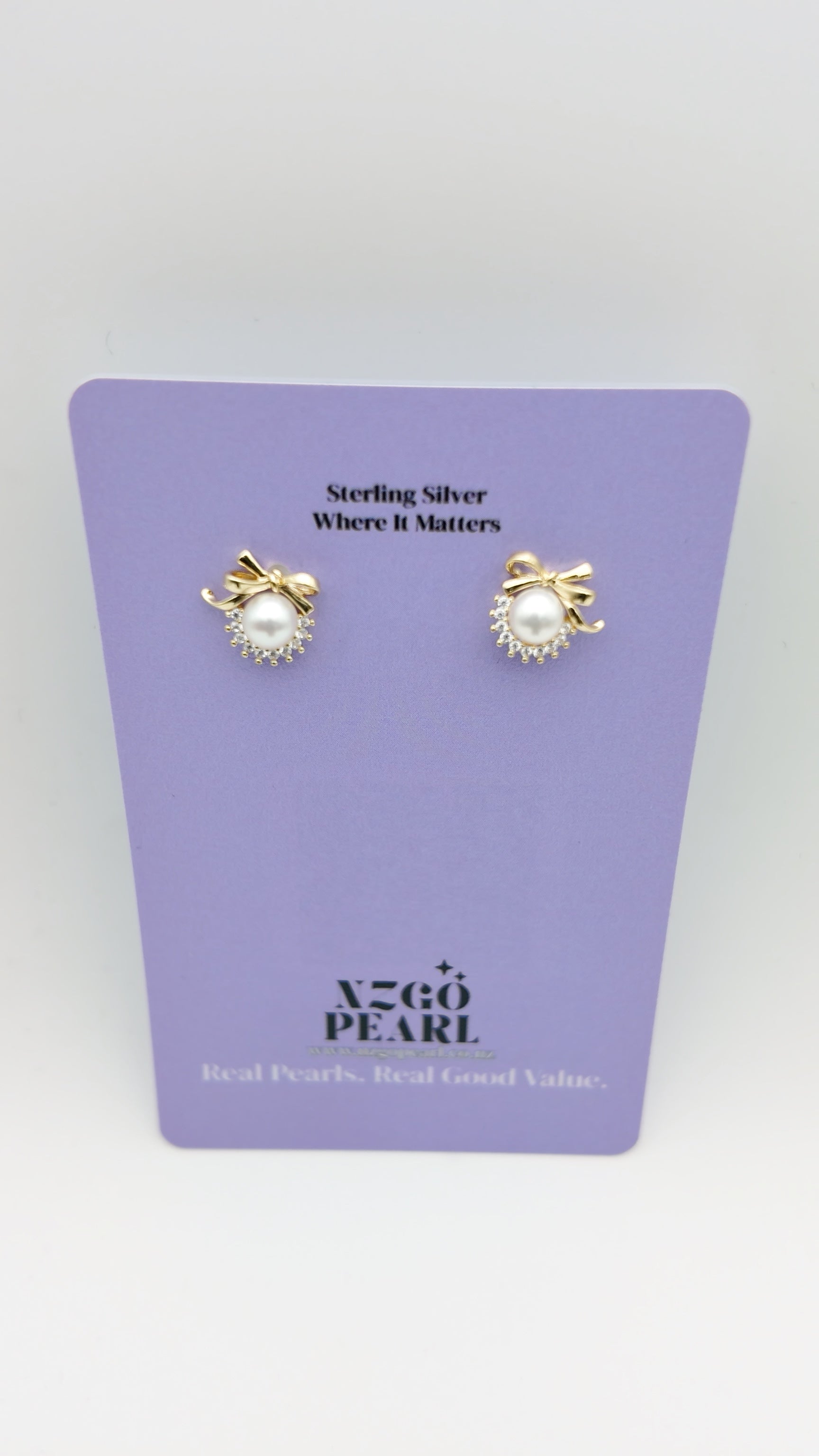 A sweet, elegant pair that blends softness with sparkle. A smooth round pearl sits beneath a delicate gold bow, finished with a shimmering CZ halo that adds just the right amount of radiance. Feminine, timeless, and perfect for gifting.