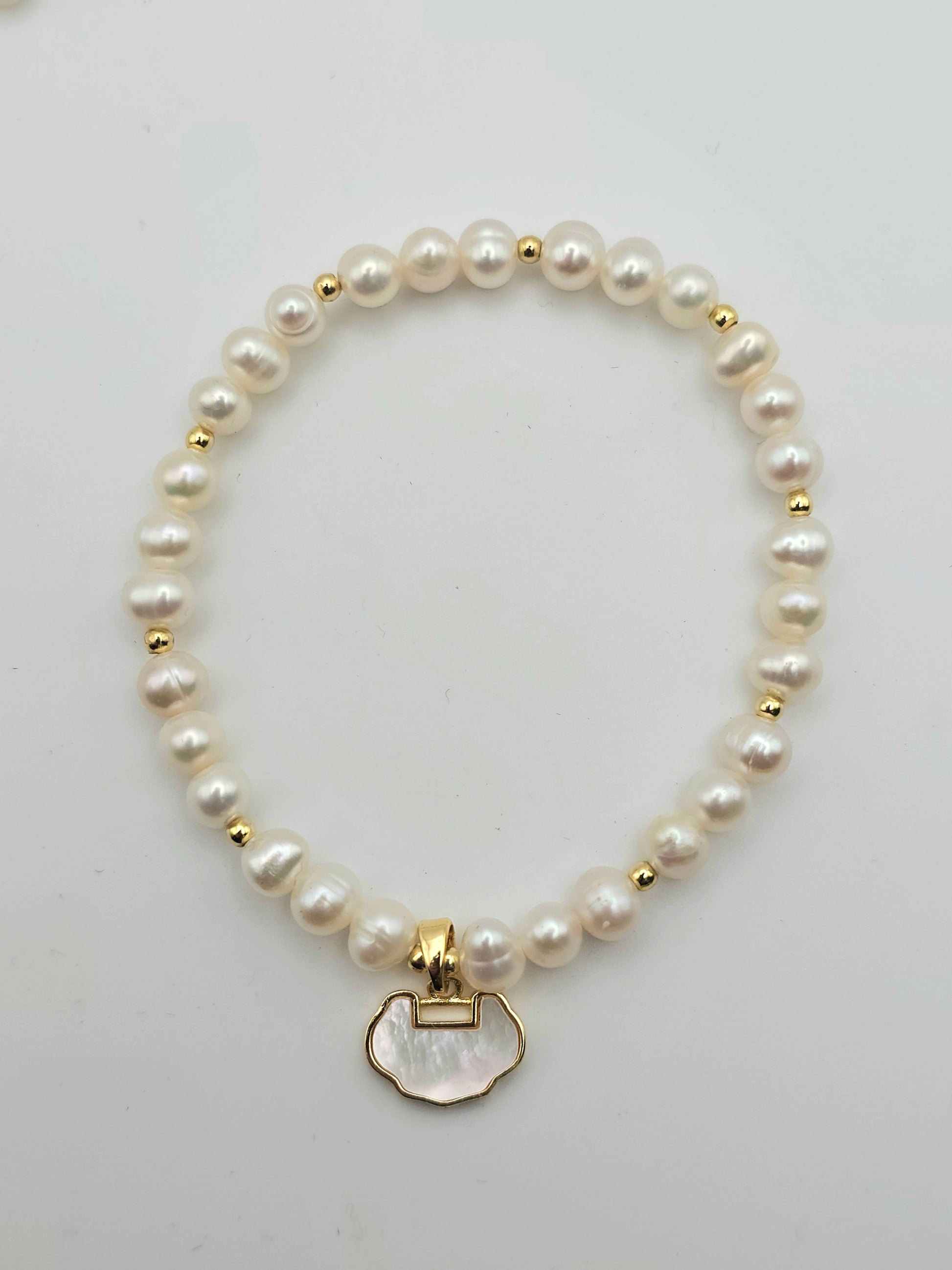 Soft as a cloud ☁️ This dreamy bracelet features luminous freshwater pearls interspersed with gold-tone beads and finished with a unique cloud-shaped charm made of iridescent mother of pearl. A symbol of calm and clarity, it’s a perfect everyday piece with a gentle twist.