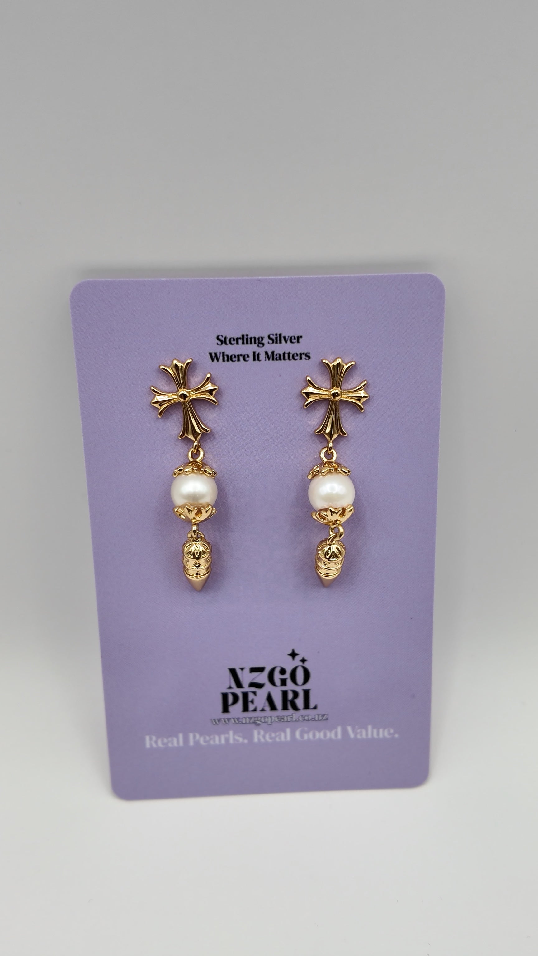 These striking drop earrings feature a sculpted gold-tone cross with softly flared edges, paired with a luminous real freshwater pearl and a tapered decorative drop beneath. The design blends vintage religious symbolism with refined elegance, creating a bold yet wearable statement.