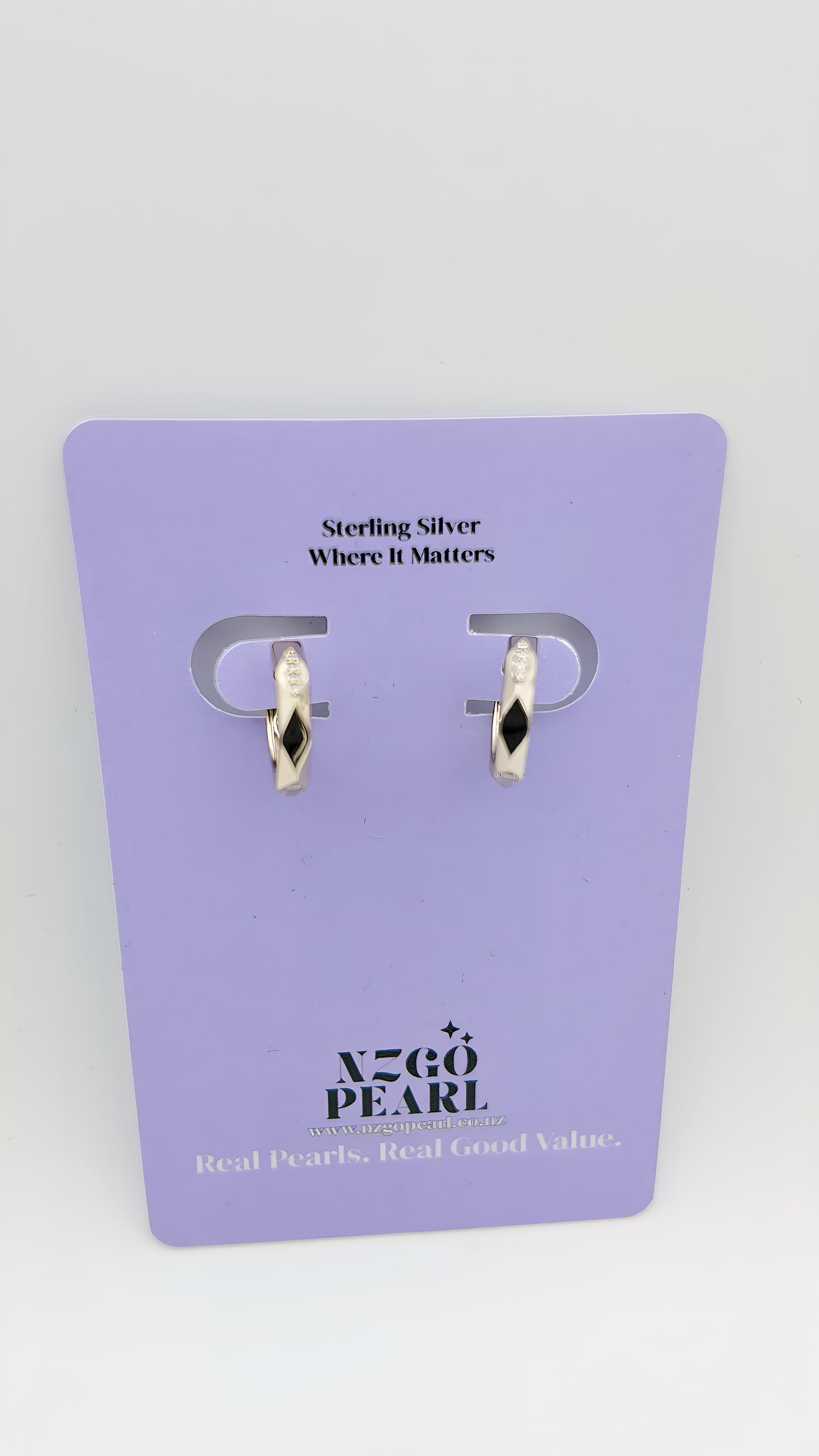 These sleek mini hoops feature a bold diamond-shaped twists, accented with a line of CZ sparkle on top. A modern, graphic look in a compact everyday size. PLEASE NOTE: There is no black diamond shaped part on this pair of hoops, it's just the reflection of lighting. The hoops is mono-tone dark silver.