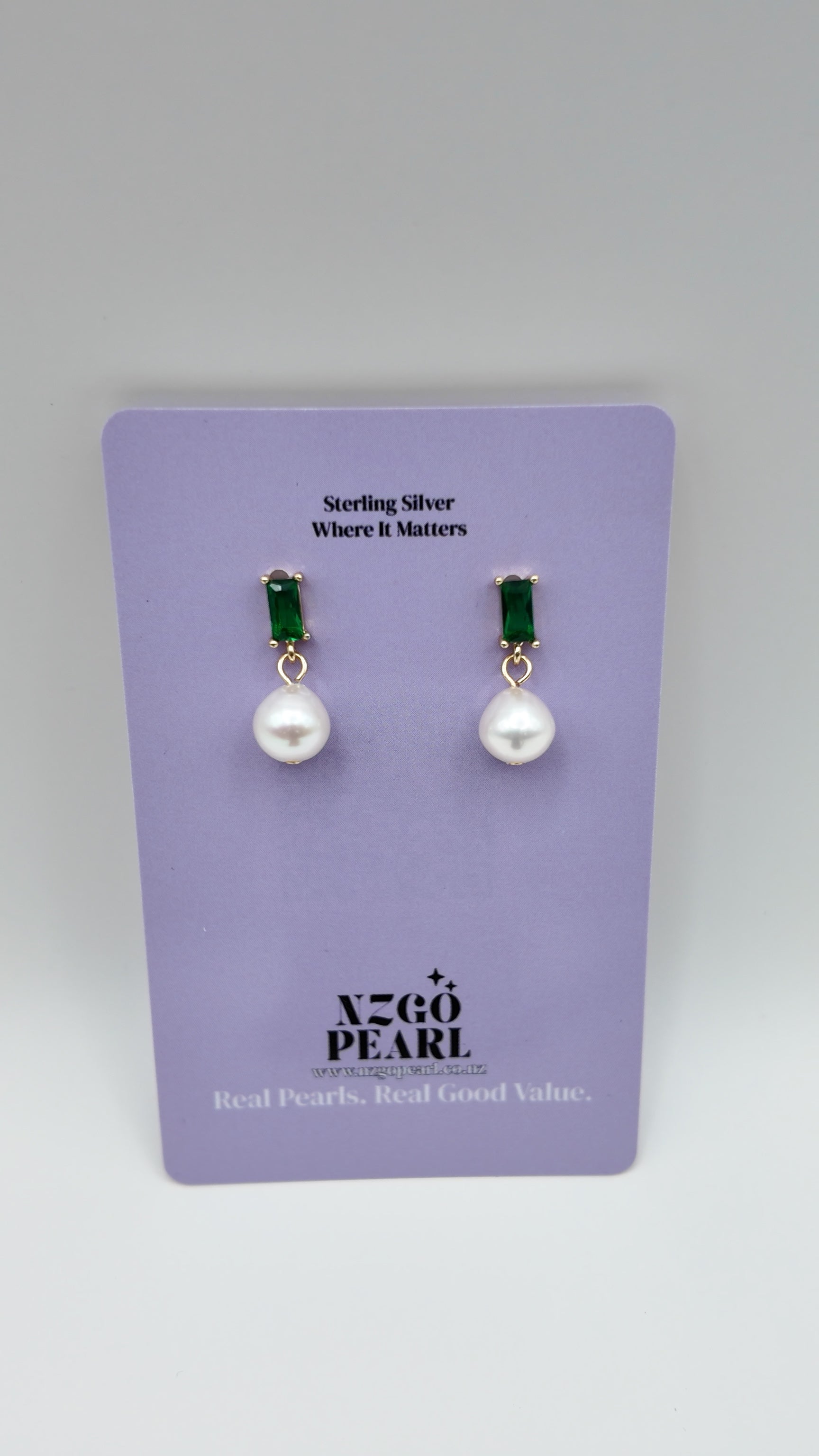 These elegant stud earrings pair a deep emerald-green baguette-cut stone with a softly lustrous real freshwater pearl drop. Gold-plated 925 sterling silver posts and settings.