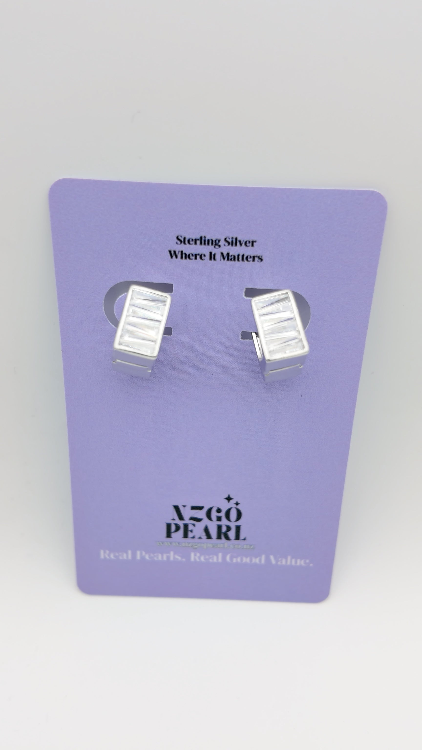 A pair of sleek, modern huggies featuring a row of baguette-cut CZ stones set inside a structured rectangular frame. Compact, polished, and stylish — perfect for those who love a minimalist sparkle with an architectural edge.