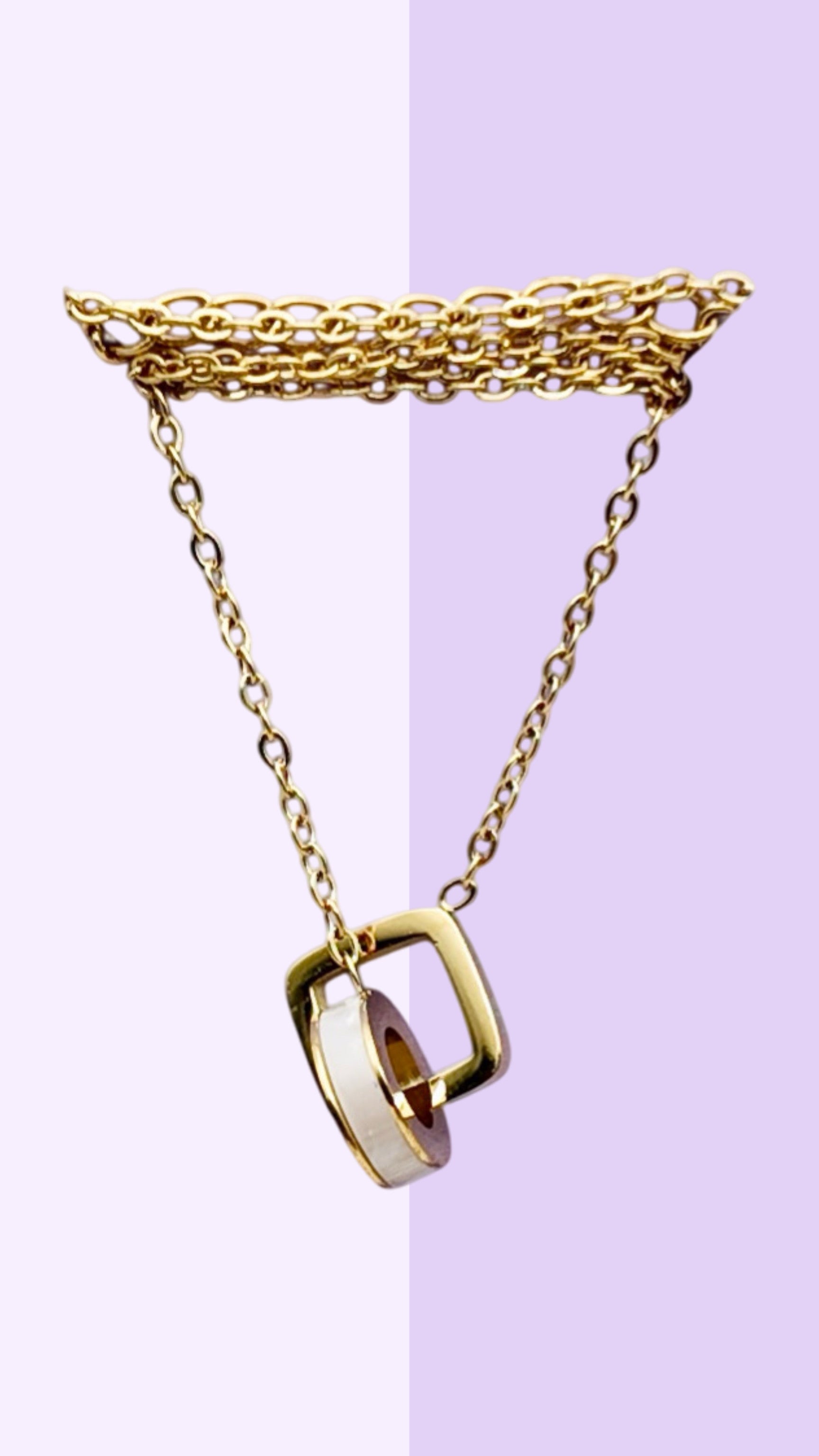 This minimalist necklace features an open geometric gold frame encircling a natural mother of pearl inlay. A clean, contemporary design that’s easy to style solo or layer with others.
