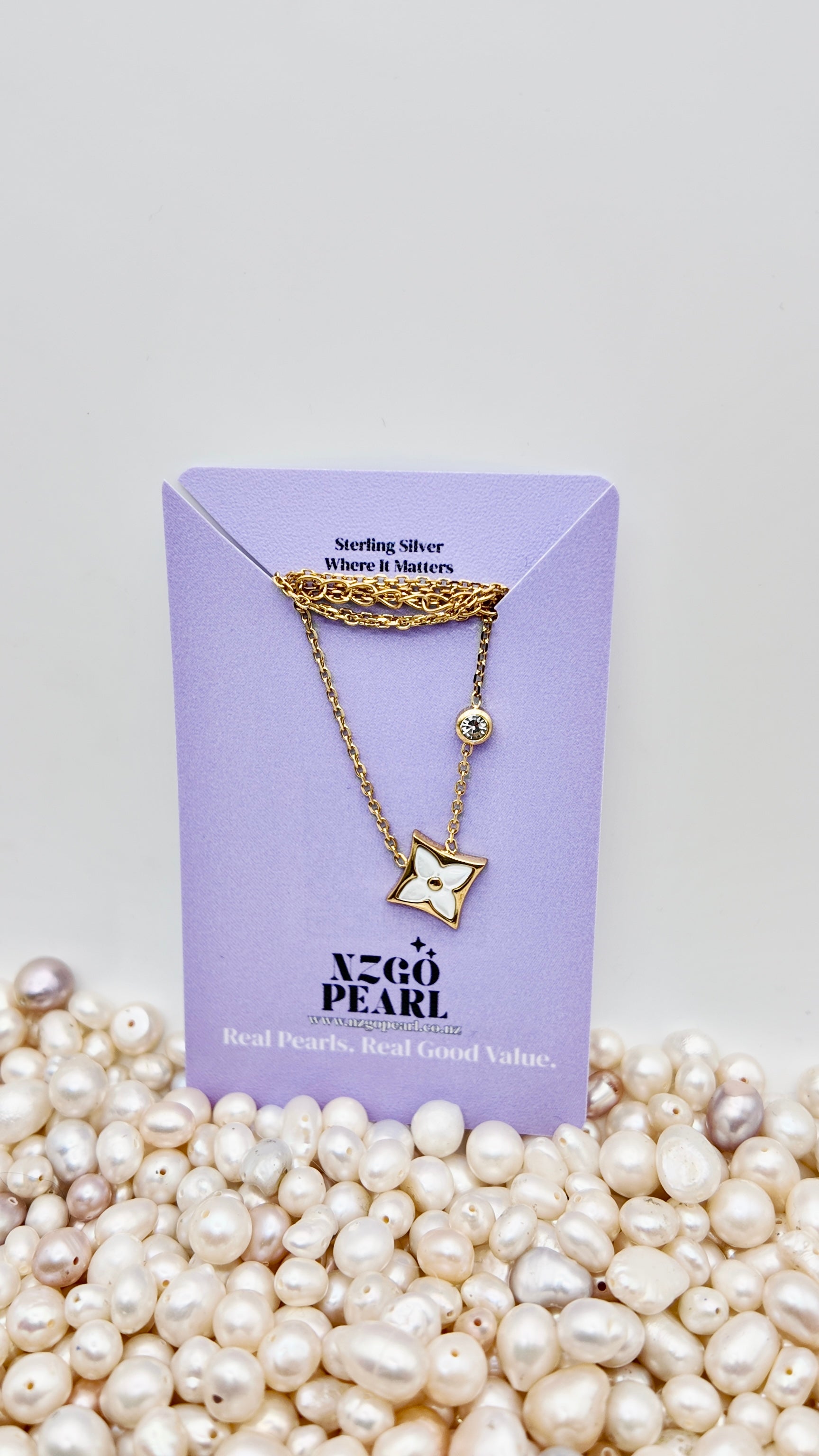 Chic with a playful twist, the Mother of Pearl Starflower Necklace features a four-petal floral shape filled with shimmering mother of pearl, offset with an asymmetric cubic zirconia charm. This piece blends elegance with a hint of fun — perfect for everyday wear or as a standout layering piece.