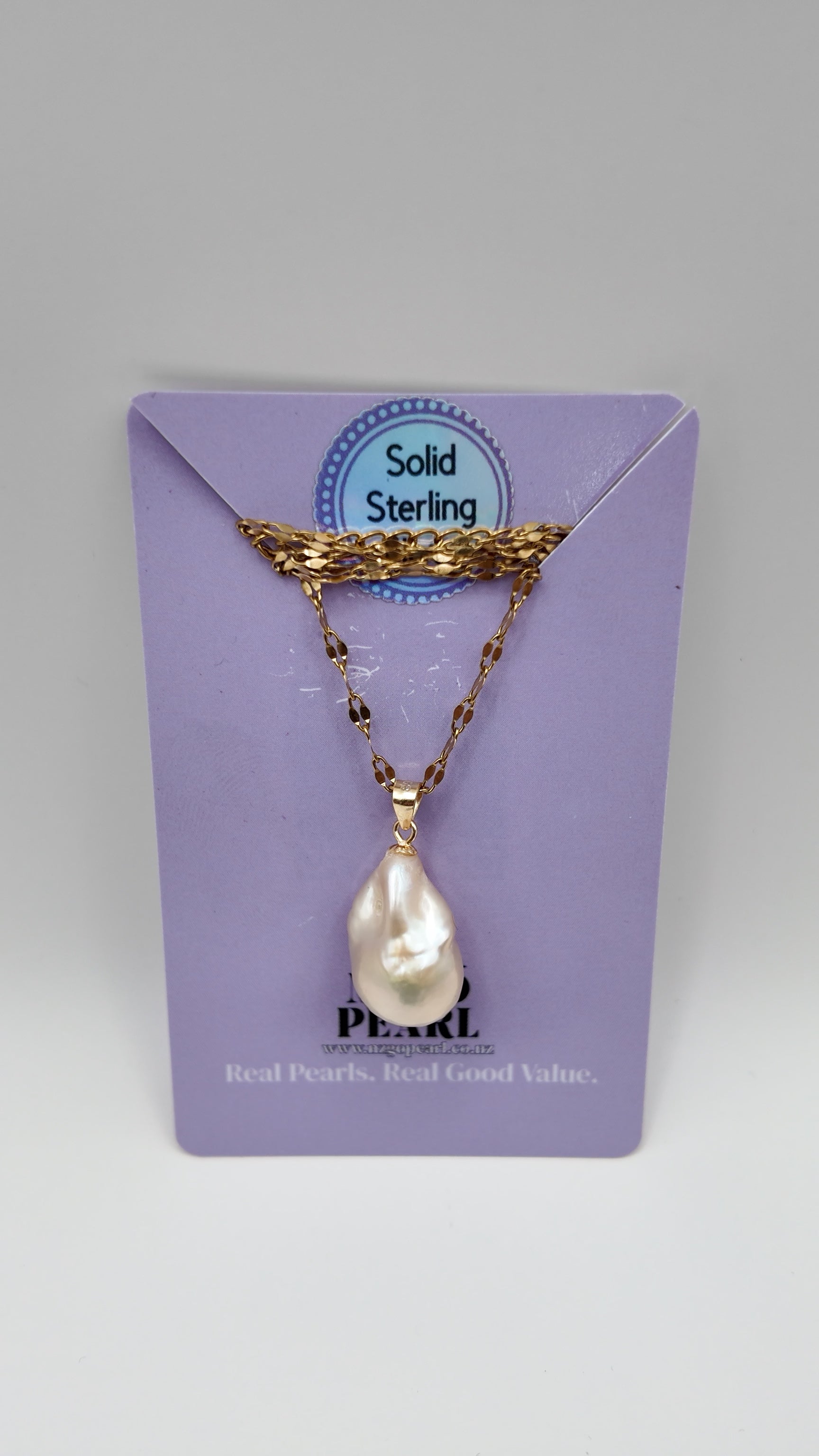 This necklace features a naturally formed baroque freshwater pearl, celebrated for its organic shape and soft, luminous glow. The pearl is suspended from a gold-tone chain, finished with a solid sterling silver clasp.