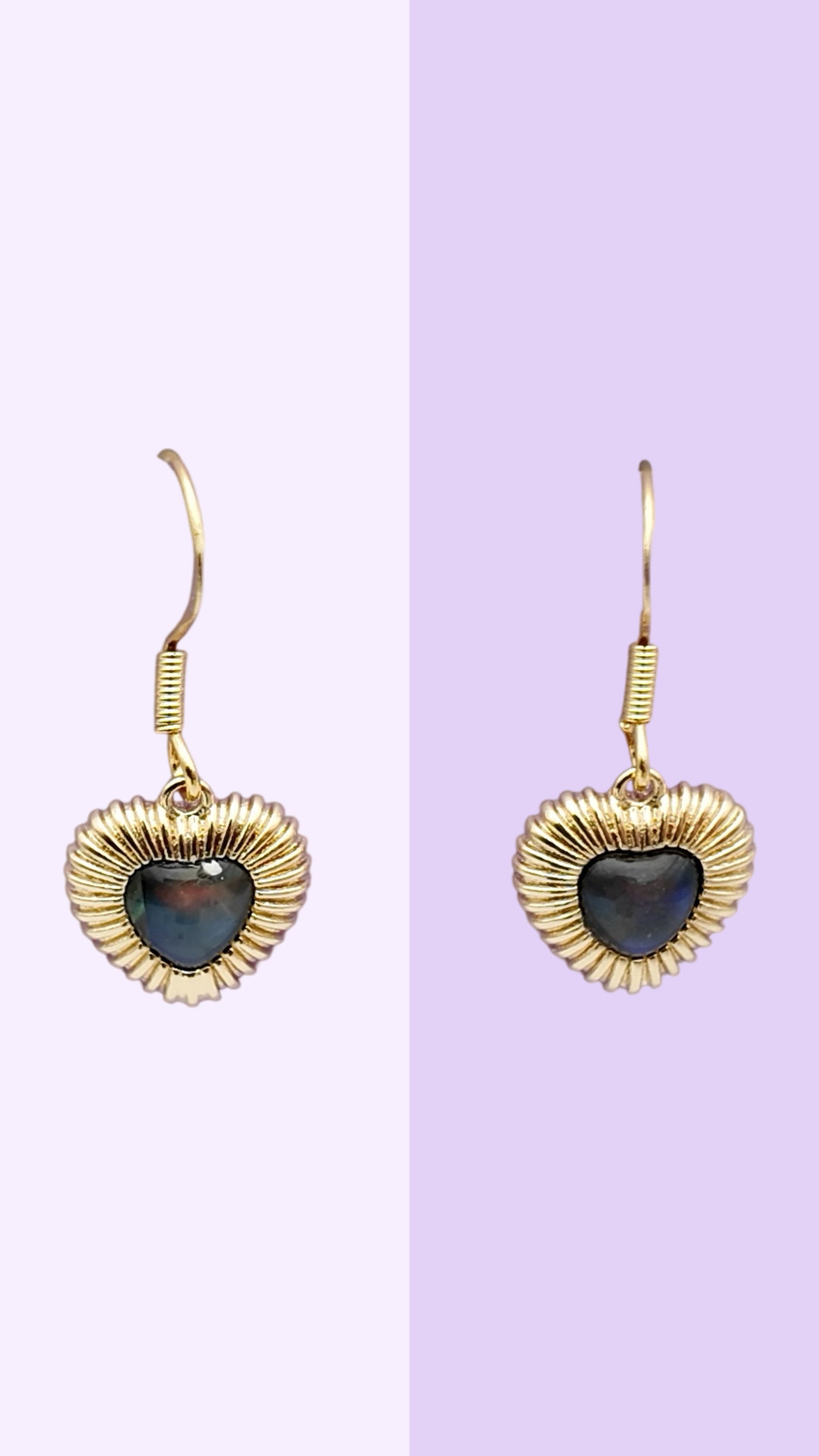 Heart-shaped earrings with genuine New Zealand paua shell — available in gold or silver.