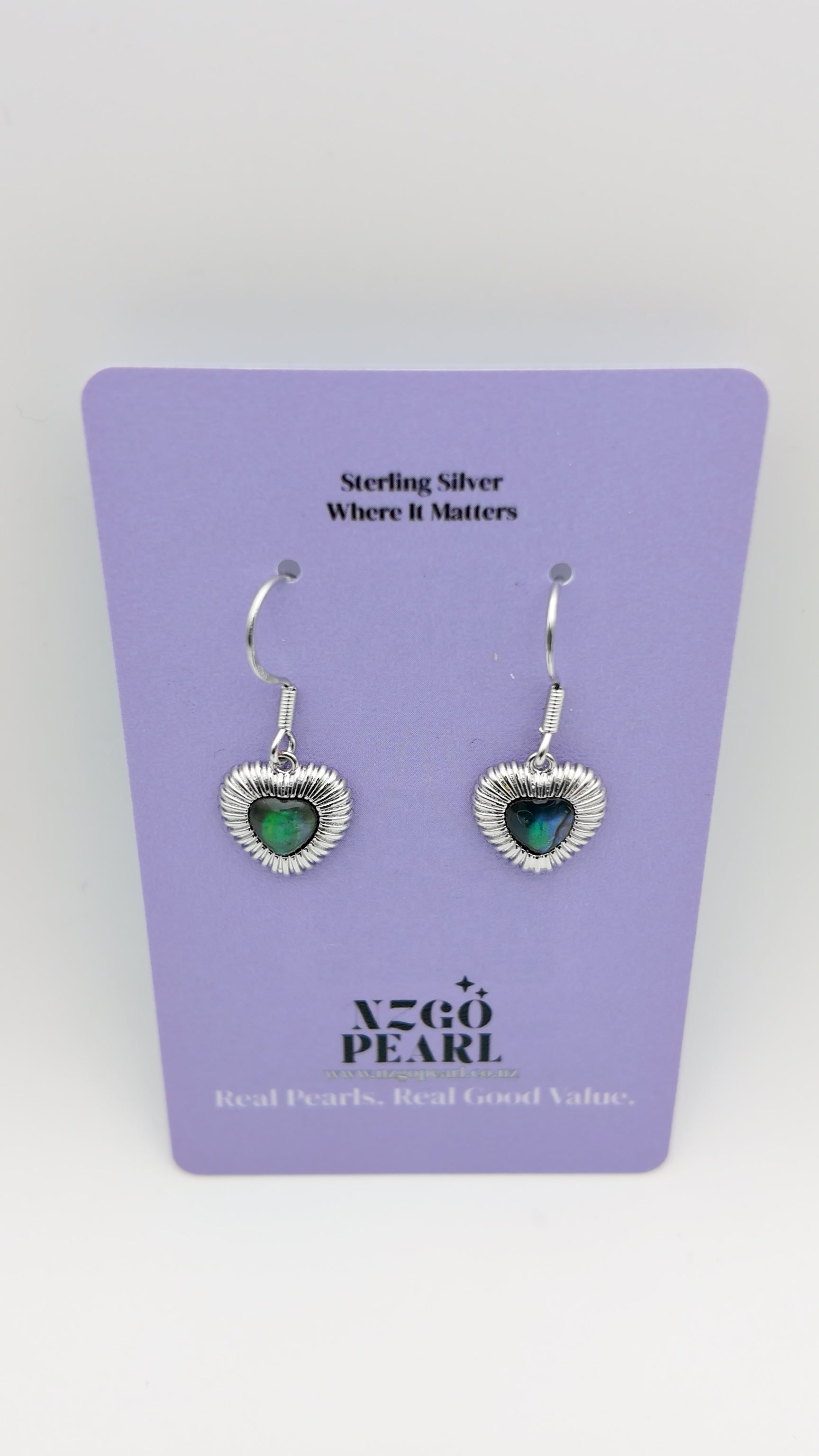 Heart-shaped earrings with genuine New Zealand paua shell — available in gold or silver.