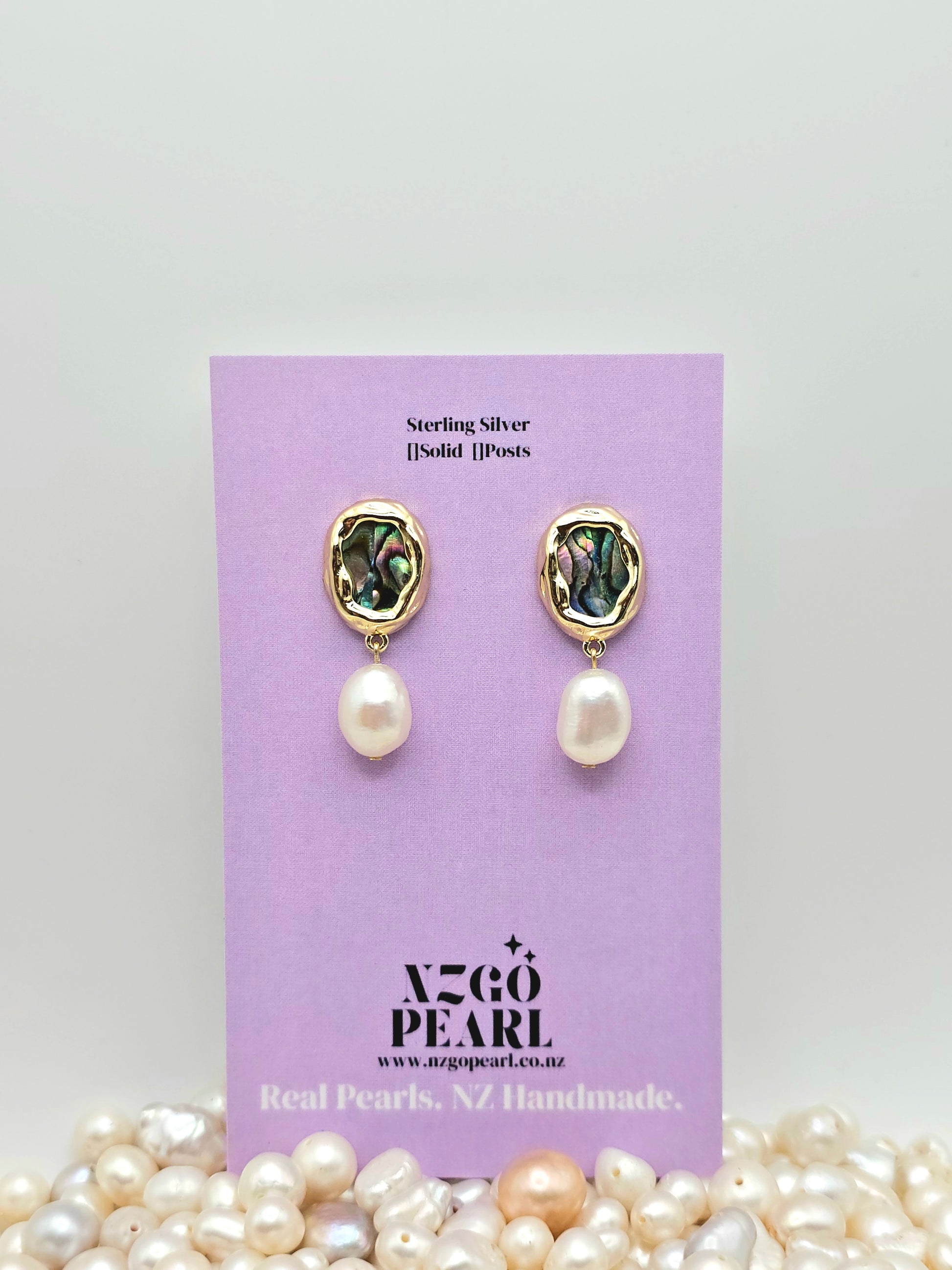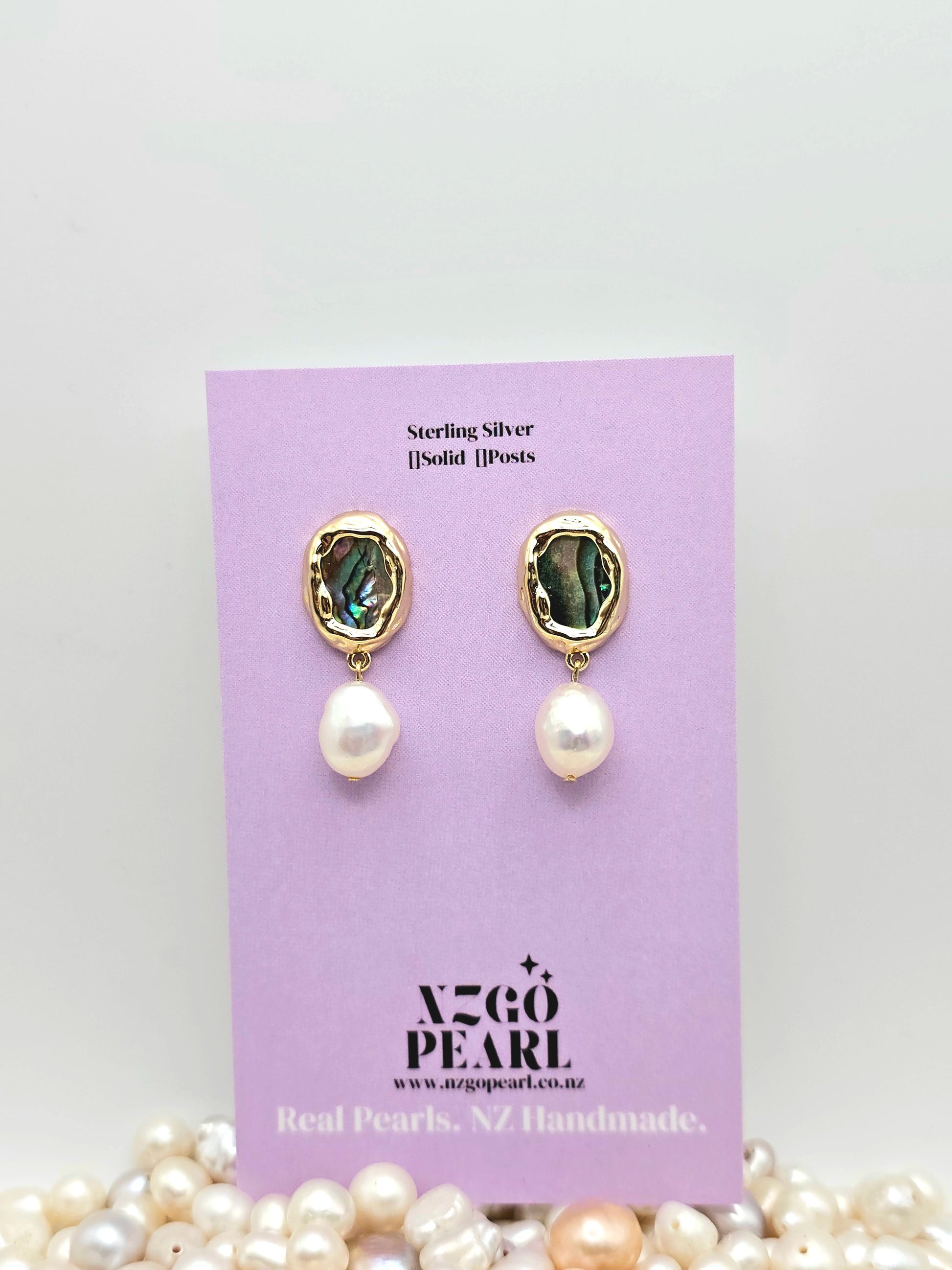 A stunning fusion of New Zealand's natural beauty — iridescent Paua shell framed in gold and finished with real freshwater pearl drops. These earrings offer an elegant way to wear a touch of Aotearoa’s ocean magic.