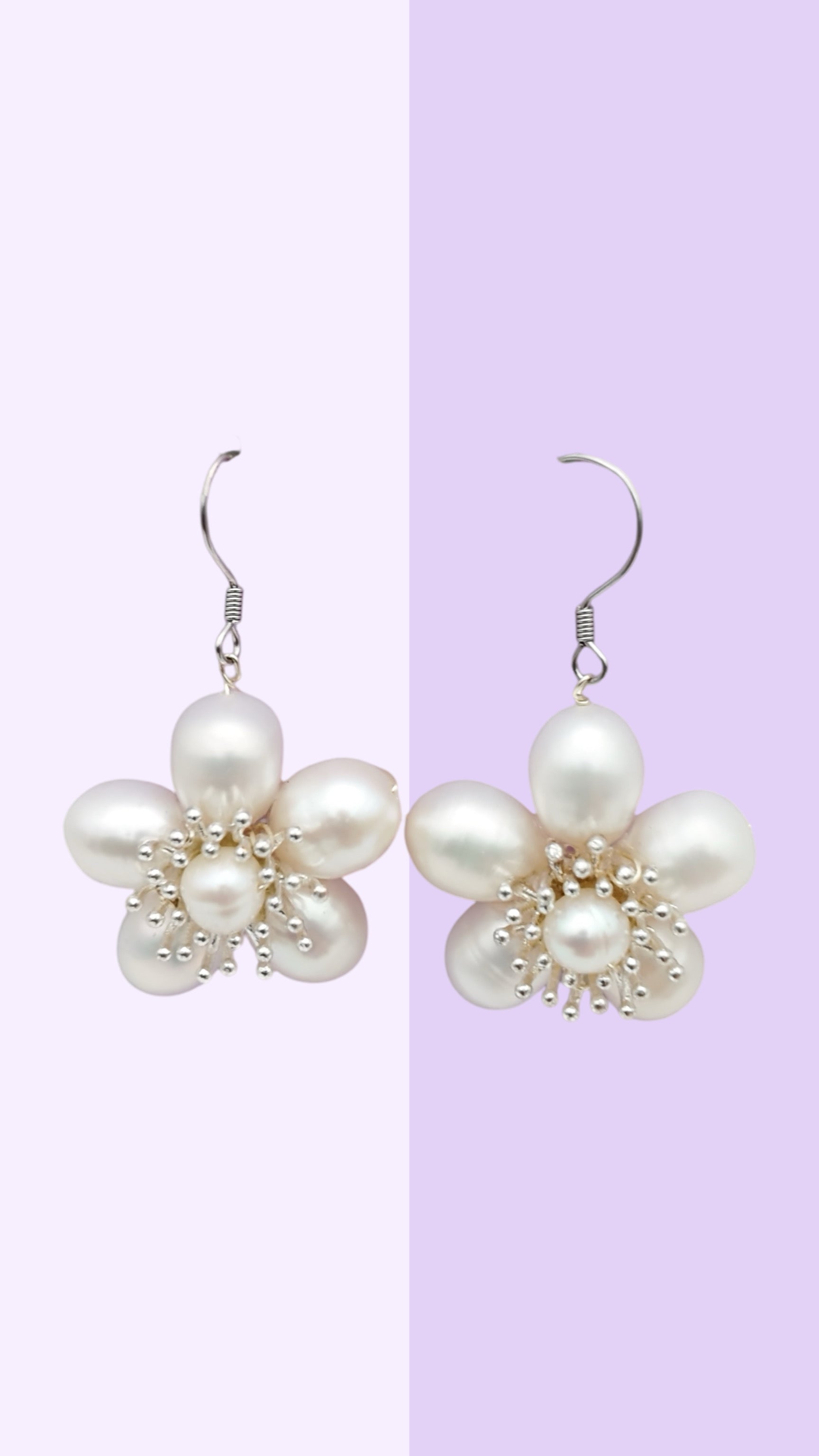 A sweet and elegant pair of handmade pearl flower earrings, each petal crafted from real freshwater pearls. The cluster centre features tiny pearl accents and silver details, giving the flowers a soft, dimensional look. Light, feminine, and perfect for adding a gentle glow to any outfit.