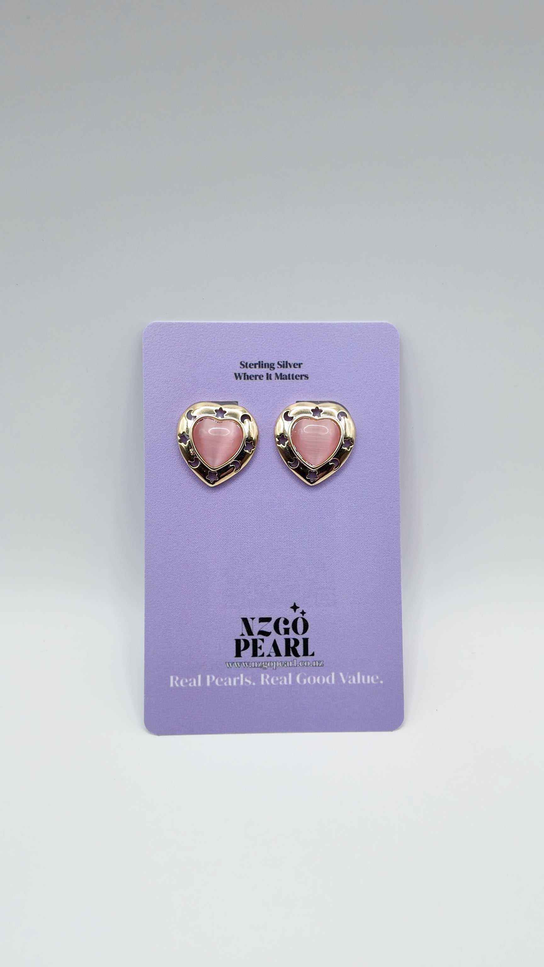 Charming studs with a soft pink heart centre framed in gold tone, accented with delicate star and crescent moon cut-outs. Whimsical and dreamy for everyday wear.