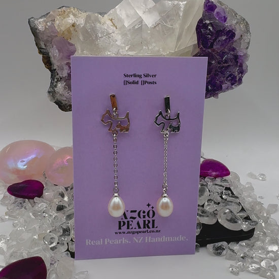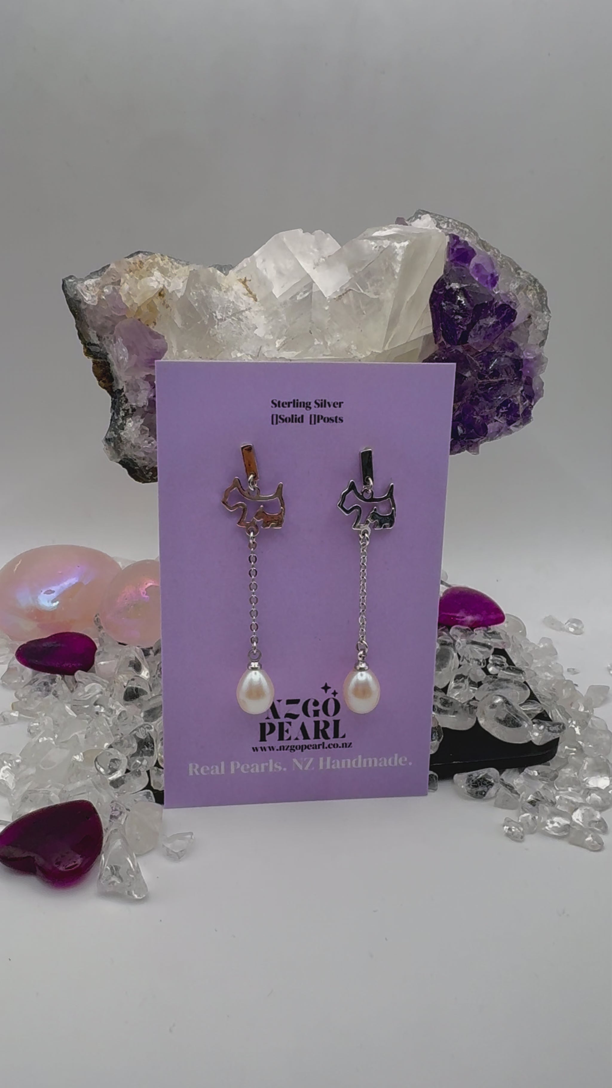 For the dog lovers with a touch of elegance. These charming earrings feature a playful dog (Scottish Terrier) silhouette along with a puppy on the side, delicately suspending a drop of luminous freshwater pearl from a fine chain. The combination of whimsy and sophistication makes them perfect for everyday wear or as a unique gift for a pet parent.