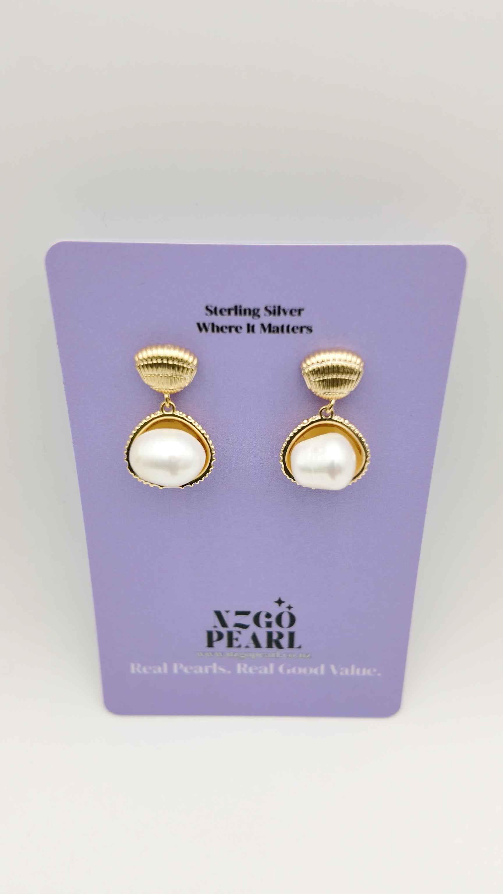 A soft seaside touch for everyday styling. These earrings pair a textured shell-inspired top with a glossy real pearl drop framed in a warm gold-toned bezel. Gently playful yet polished, they bring a coastal elegance to any outfit.