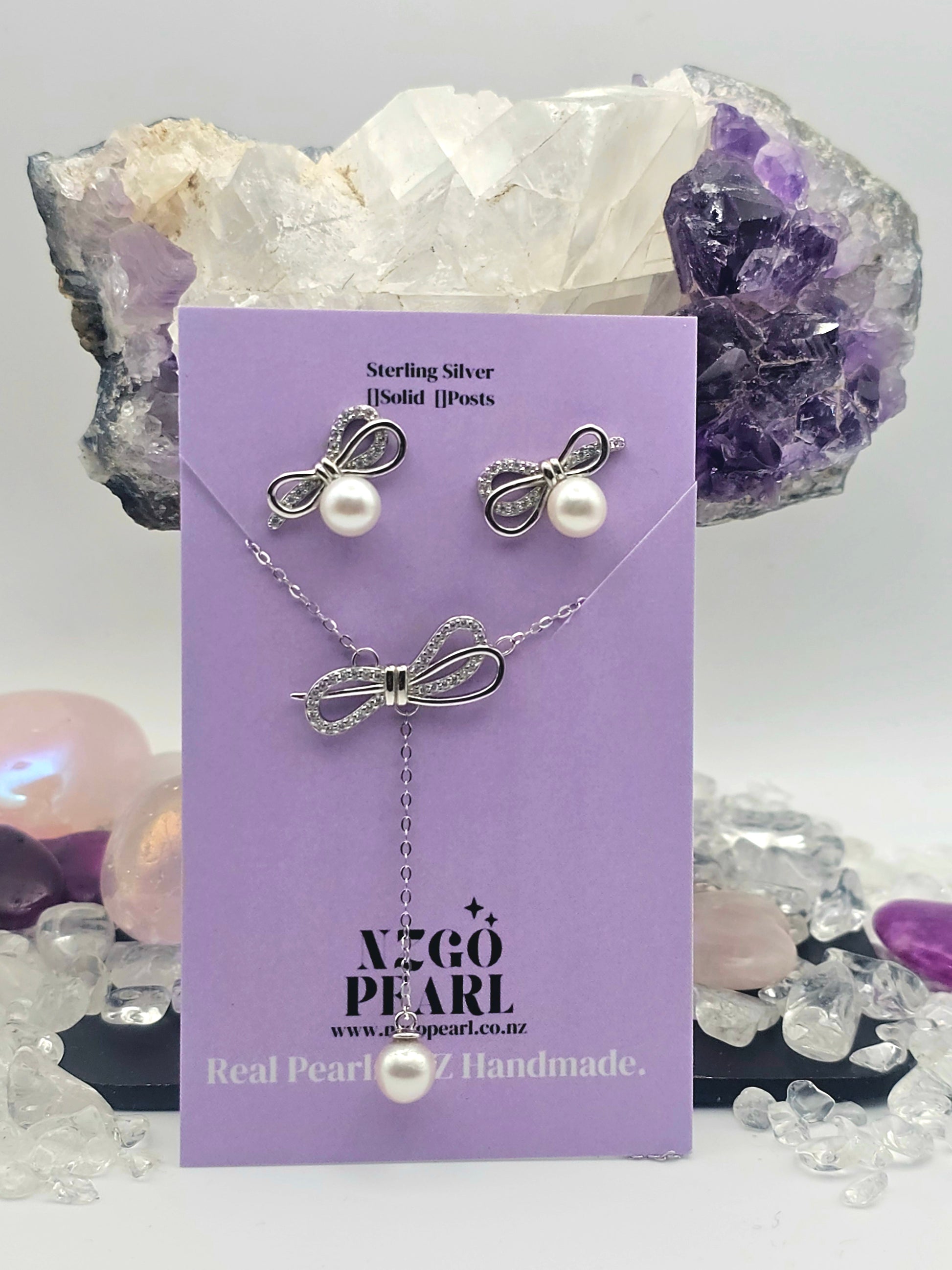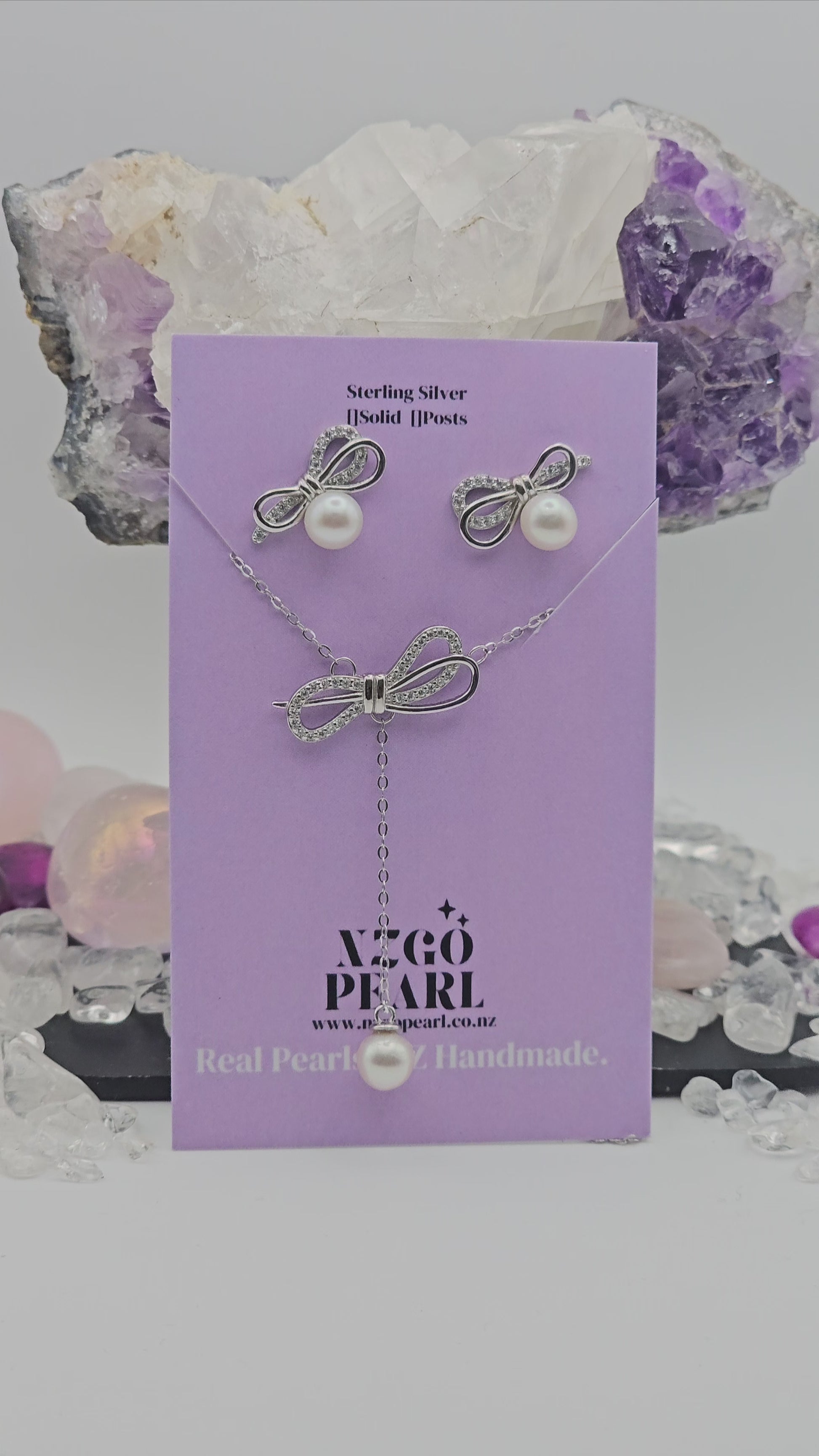 This charming set features a matching pair of earrings and a necklace, designed with delicate bow motifs sparkling with CZ stones. Each piece is finished with a luminous freshwater pearl drop that adds a timeless, elegant touch. The refined silver tone brings a soft sophistication to the whole set.