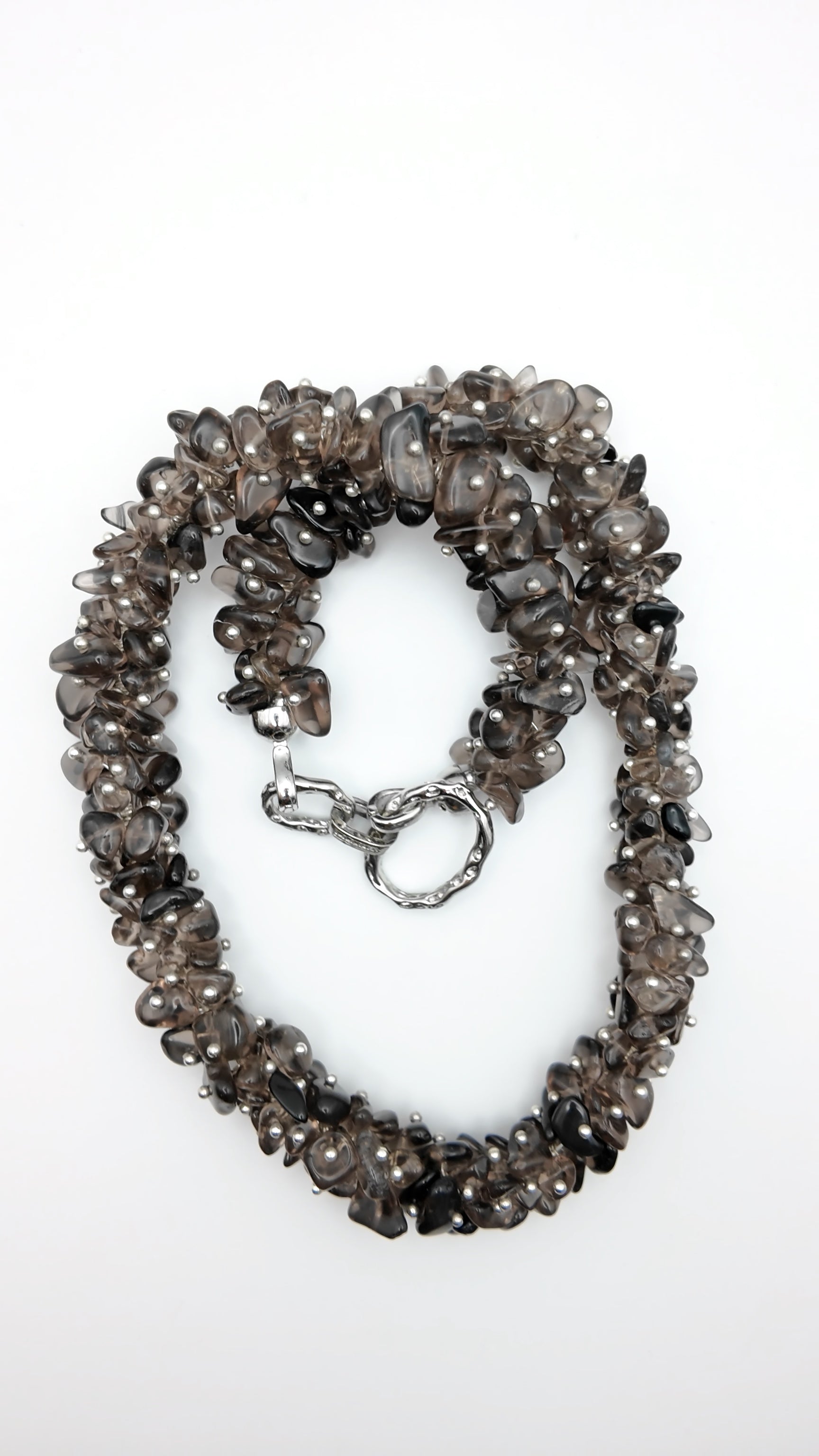 This textured necklace is made with natural smoky quartz stones, layered closely together to create a rich, organic look. The translucent brown-grey tones of smoky quartz give the piece depth and softness, while small silver-tone bead accents add subtle contrast and detail throughout.