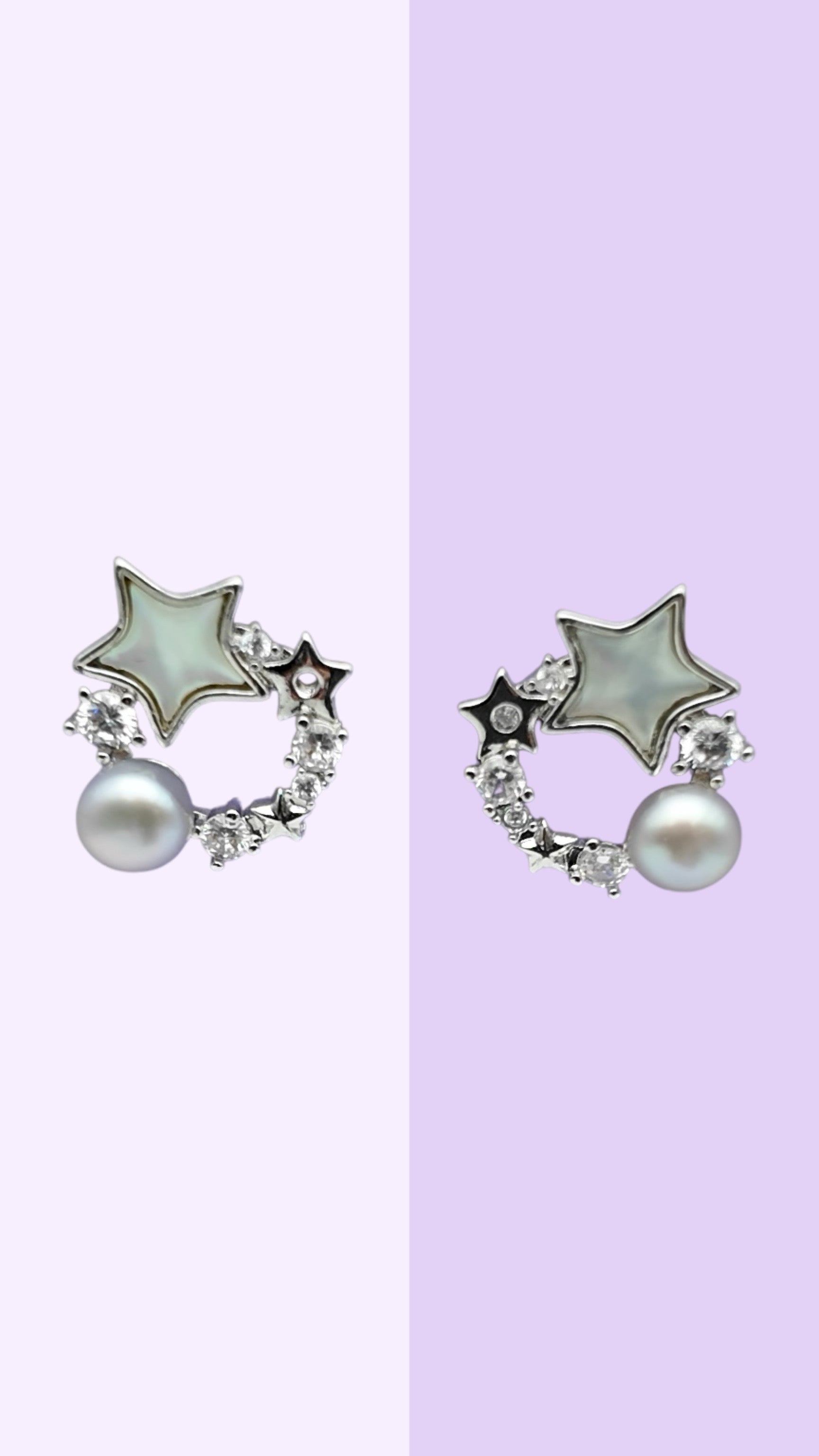 A dreamy little constellation you can wear. These stud earrings feature a glowing mother-of-pearl star, a tiny metallic star, and a ring of sparkling stones that frame a soft white pearl. Playful, elegant, and effortlessly eye-catching.