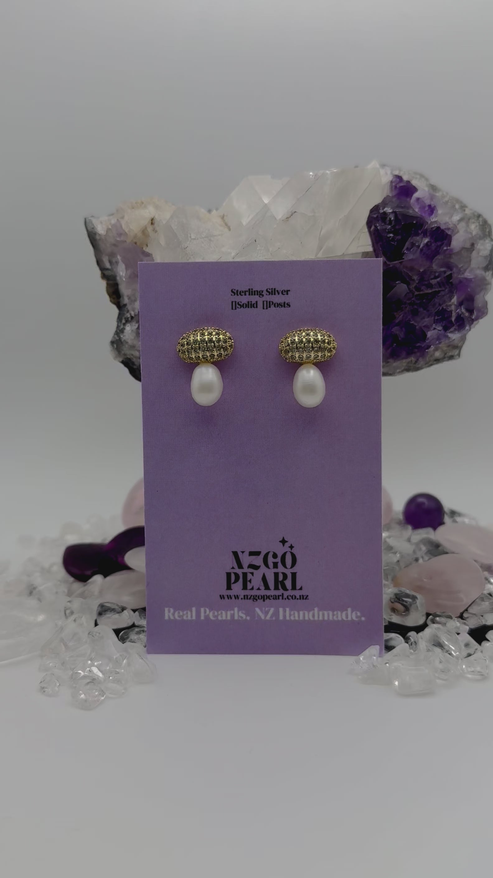 These exquisite earrings feature an oval-shaped gold-plated top, fully encrusted with shimmering cubic zirconia (CZ) stones, adding a luxurious sparkle to the design. The elegant oval form enhances the refined look, beautifully complementing the smooth, lustrous freshwater pearls that dangle gracefully below.