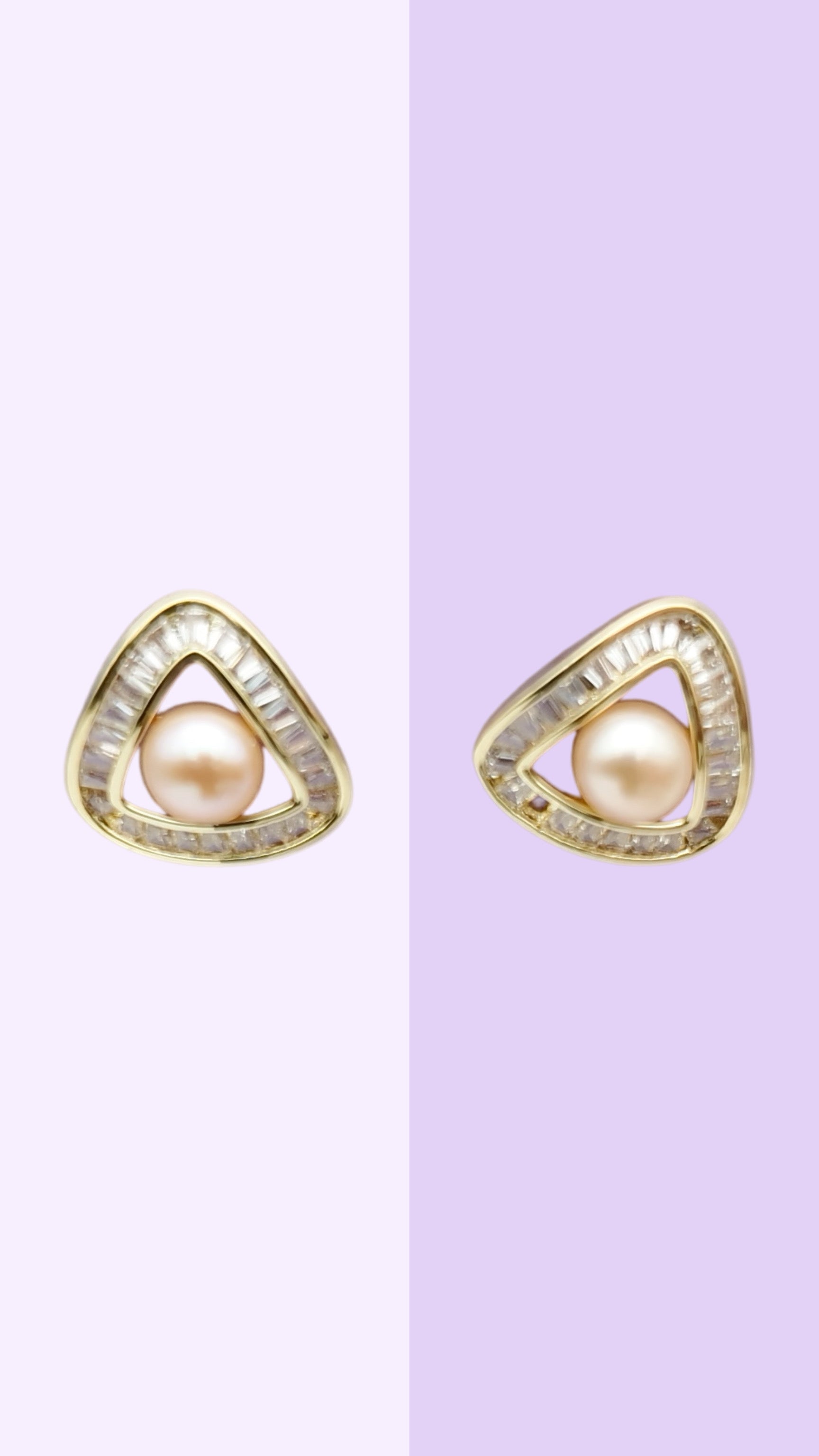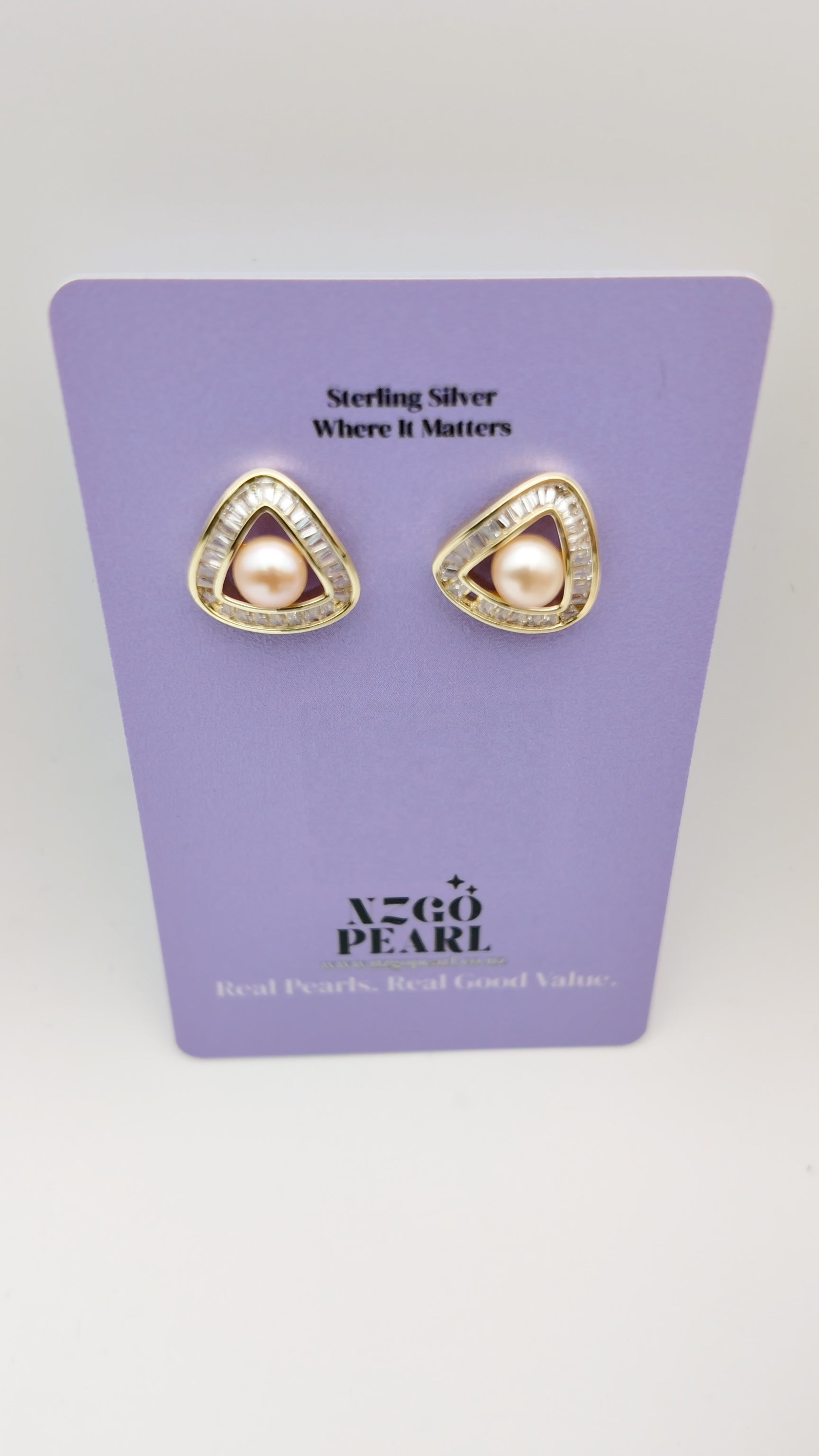 A modern geometric twist on classic pearls. These triangular studs feature a soft golden frame inlaid with clear baguette-cut CZs, embracing a single luminous pearl at the centre. Elegant, structured, and eye-catching in the most polished way.