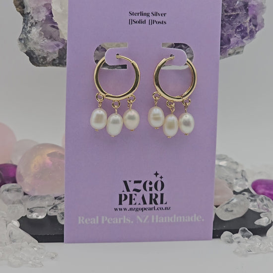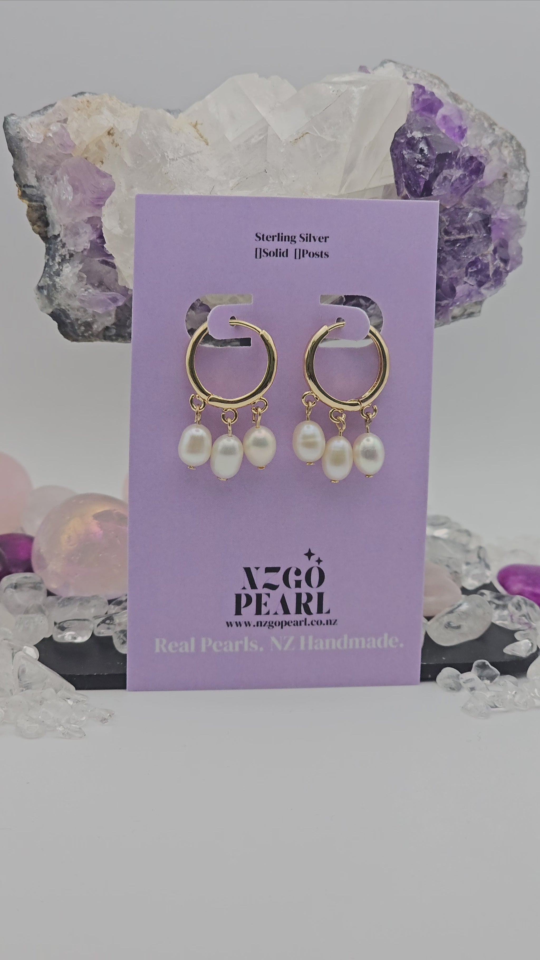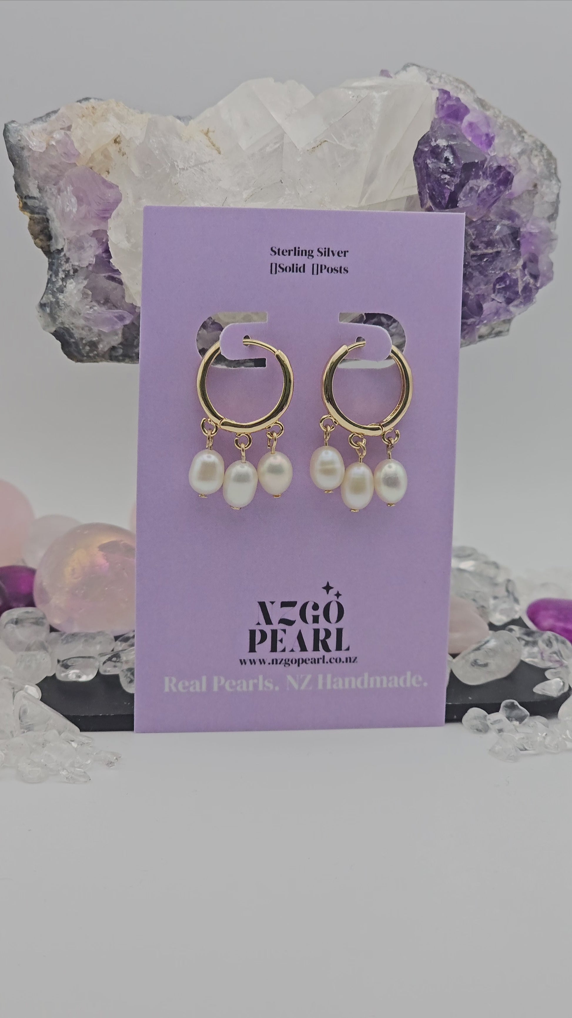 Lightweight and full of charm, these Trio Drop Pearl Hoops feature three petite freshwater pearls dancing from sleek gold-plated sterling silver hoops. The movement of each pearl adds a subtle sparkle and playfulness to your look – perfect for brunch dates, weddings, or any moment that deserves a little glam.
