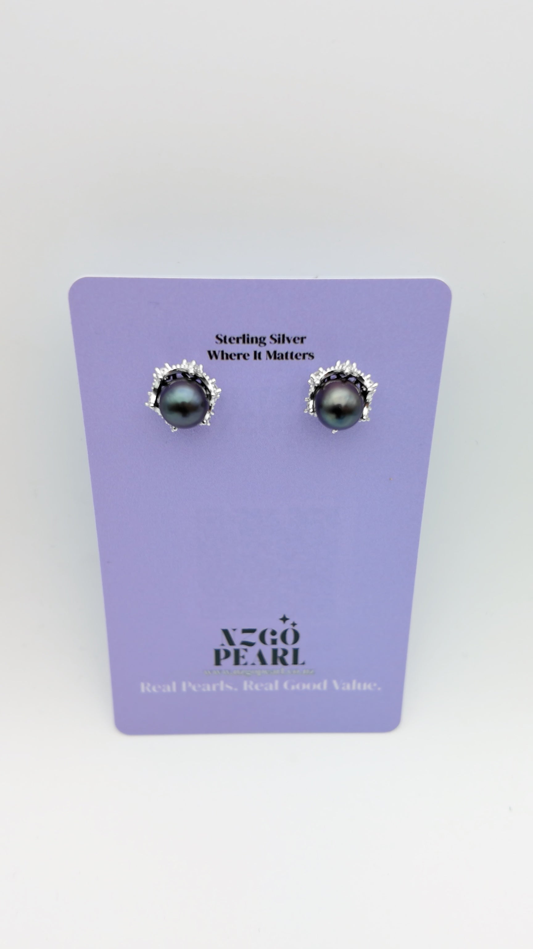 A classic black pearl look with a sleek, glossy finish. These true-black pearls sit in a textured silver-tone crown setting, giving them a refined yet contemporary feel. Timeless, versatile, and effortlessly polished.