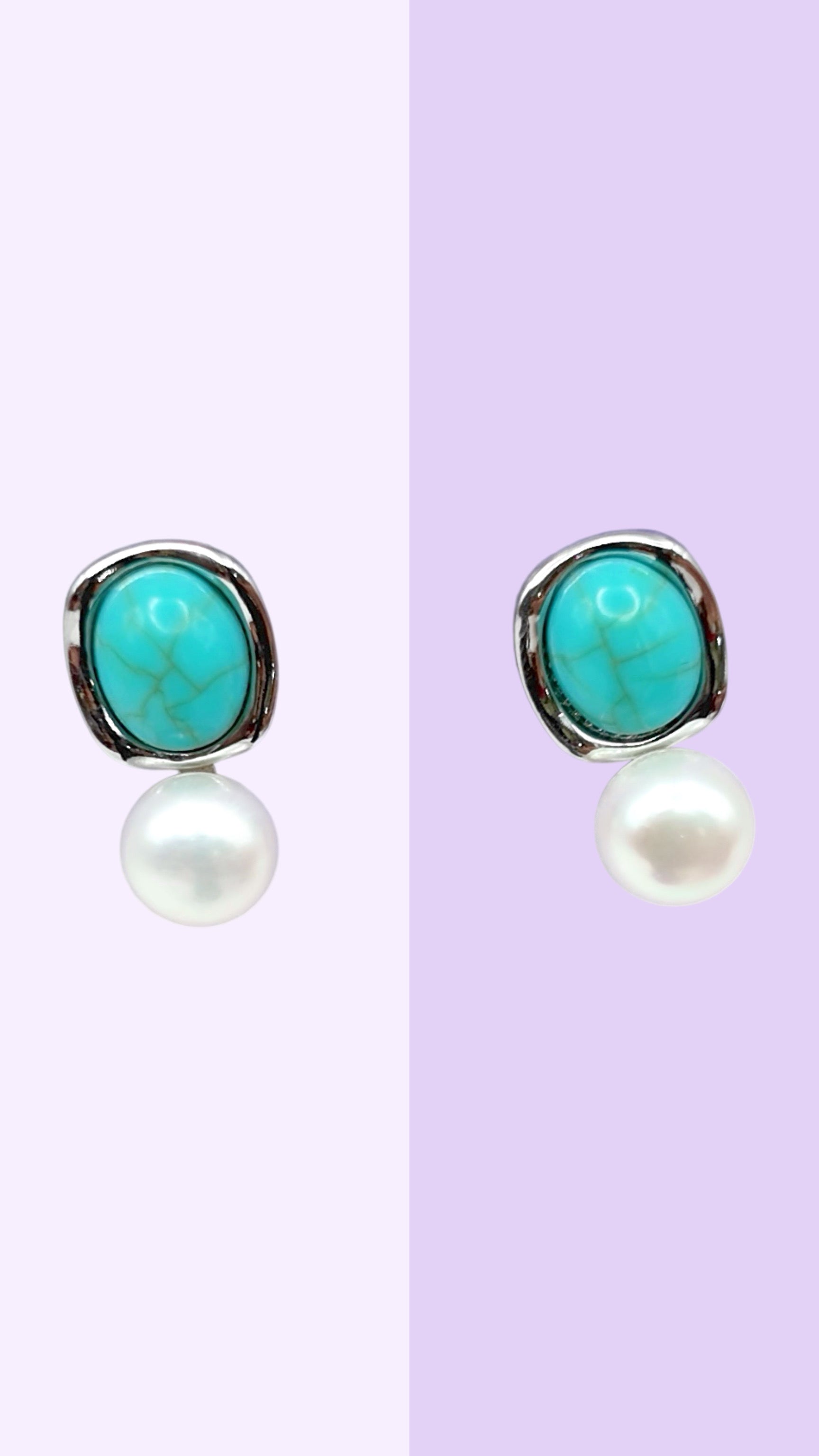 These elegant stud earrings pair a vibrant turquoise-coloured stone with a classic round freshwater pearl, creating a fresh contrast between colour and softness. Finished with solid sterling silver posts.