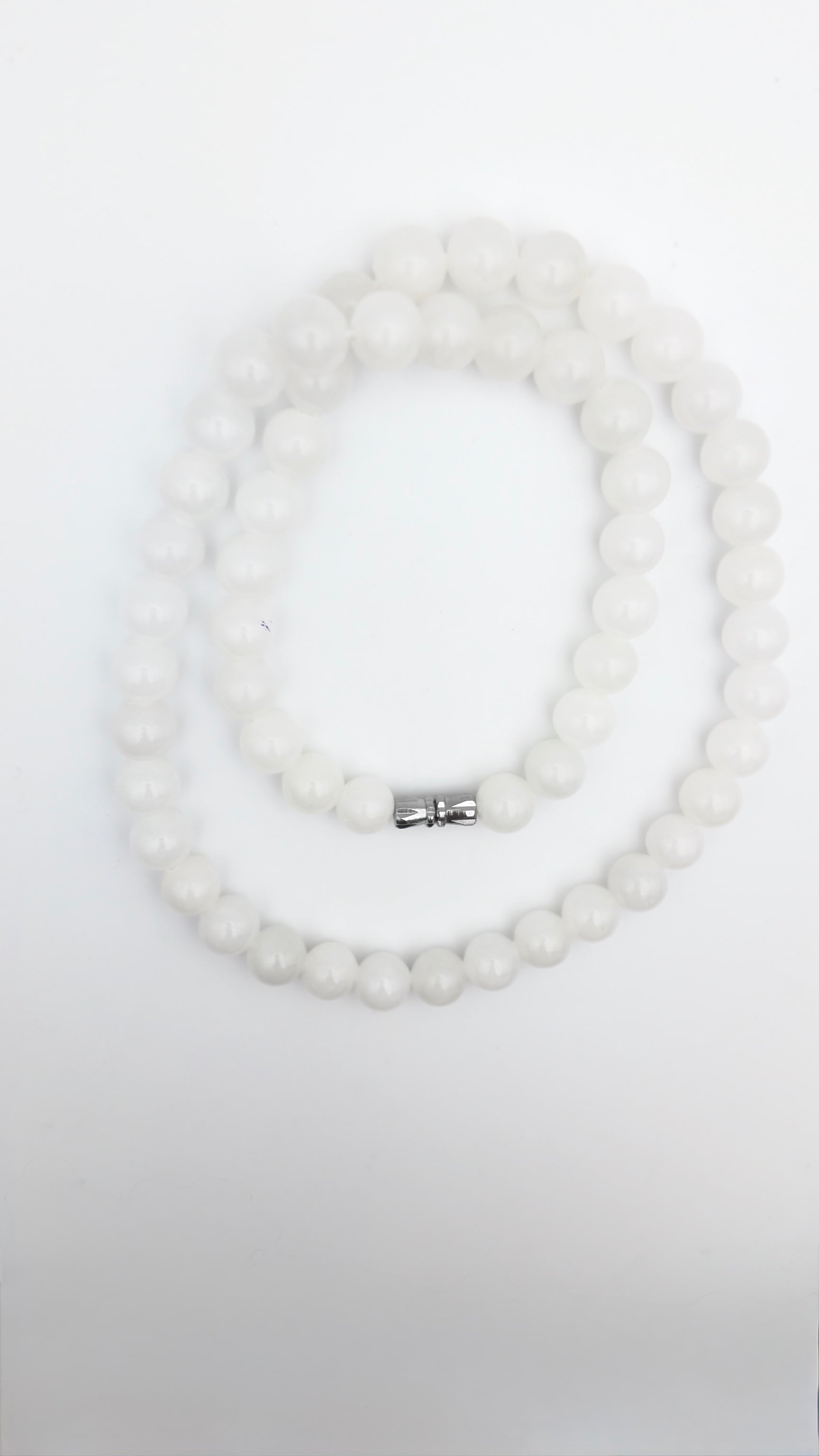 This minimalist beaded necklace is made with smooth, milky white natural stone beads, offering a soft and calming look that pairs easily with any outfit. The gentle translucency and even polish give it a refined feel, making it suitable for both everyday wear and simple layering.